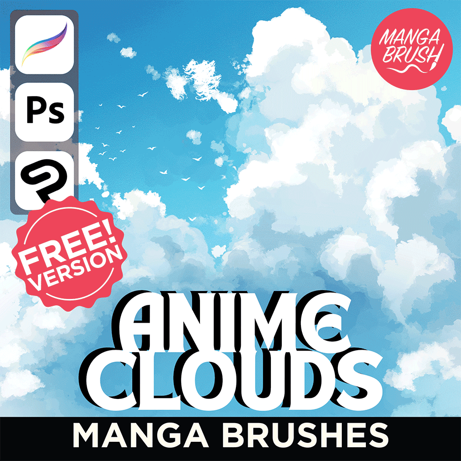 ANIME CLOUDS SAMPLE BRUSH PACK contains 3 FREE cloud brushes referencing traditional anime clouds for Photoshop, Clip Studio Paint, and Procreate.