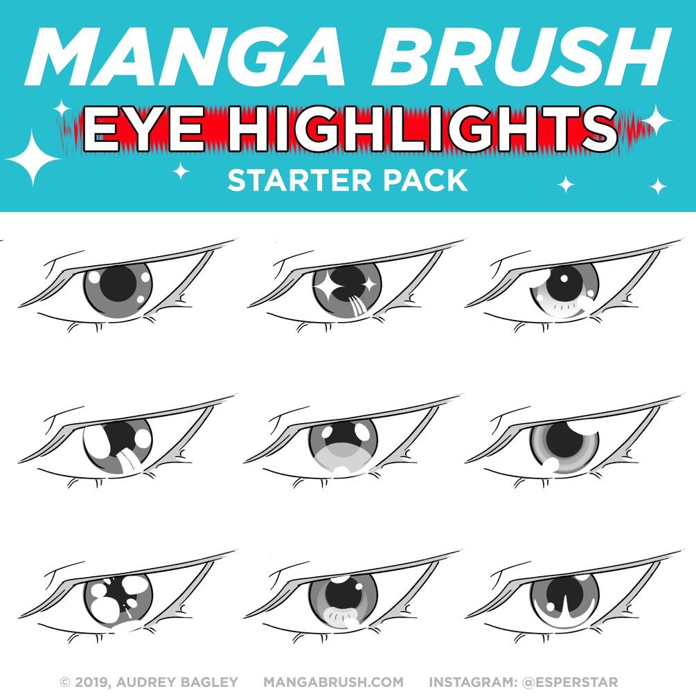 Manga Brush EYE HIGHLIGHTS Pack Version 1.0. This pack currently contains more than 15 eye highlight brushes for PHOTOSHOP and PROCREATE.