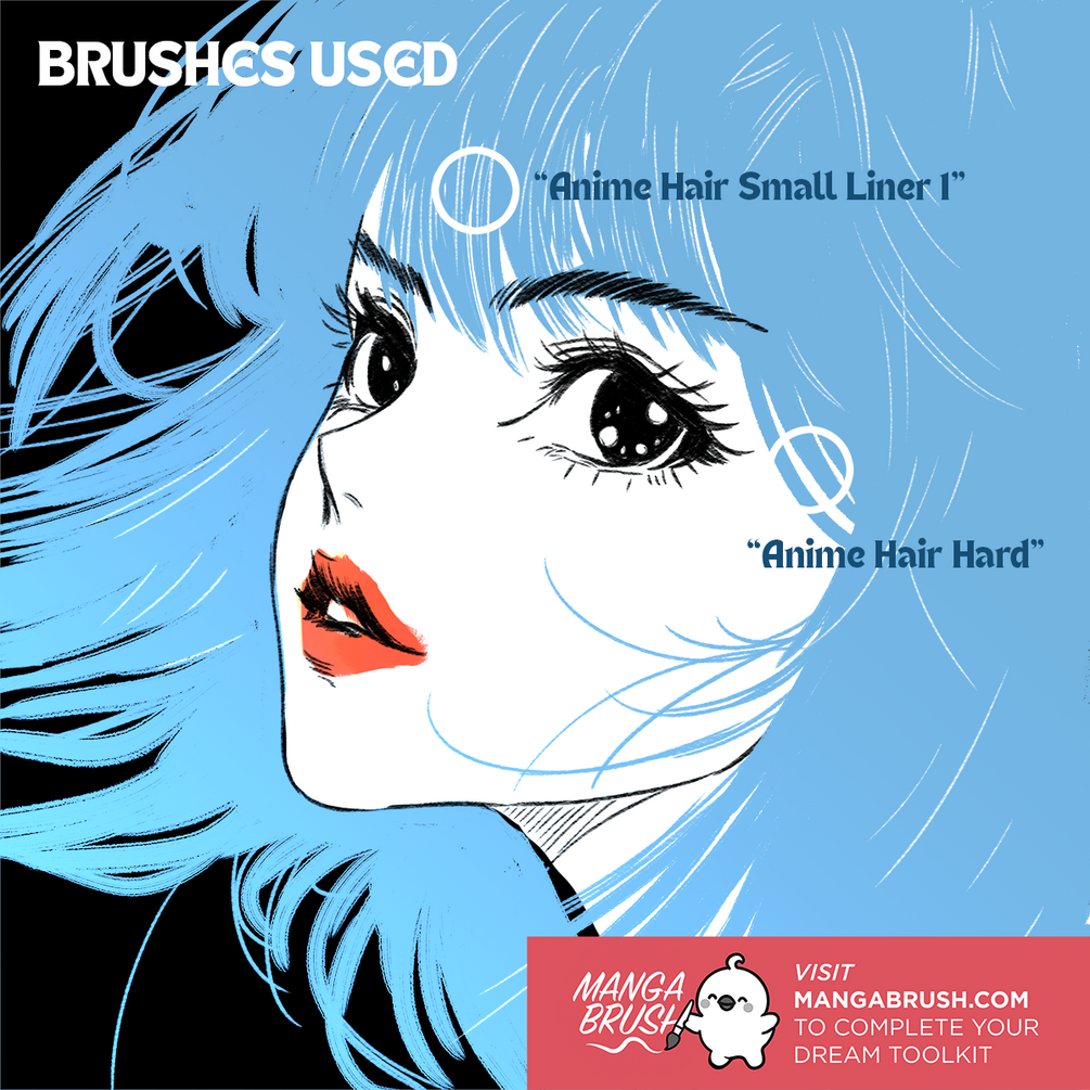 The Anime Hair Sample Brush Pack includes 3 FREE anime hair brushes inspired by traditional straight, wavy, curly, and braided anime & manga hair styles.