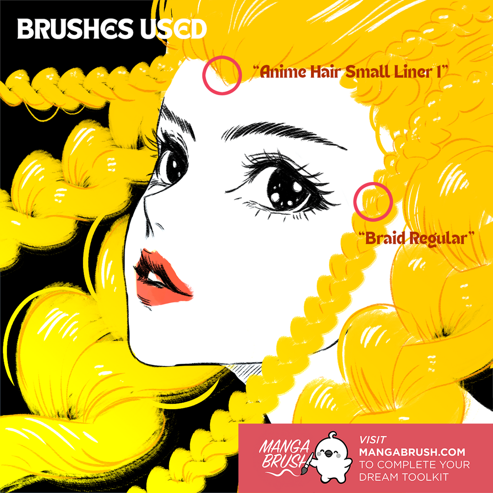 The Anime Hair Sample Brush Pack includes 3 FREE anime hair brushes inspired by traditional straight, wavy, curly, and braided anime & manga hair styles.